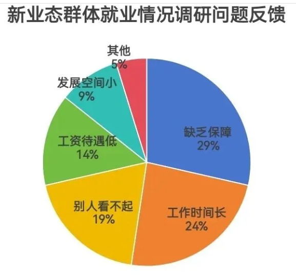 近年来,随着海南自由贸易港建设的推进,外卖小哥、快递员、网约车司机等新业态群体蓬勃发展,作为城市生活服务的“摆渡人”,他们已然成为城市运转不可或缺的力量。然而,通过调研了解到外卖小哥等人群所面临的五大突出问题(如图),按照比例排序为:1.缺保障;2.工作时间长;3.别人看不起;4.工资低;5.发展空间小。